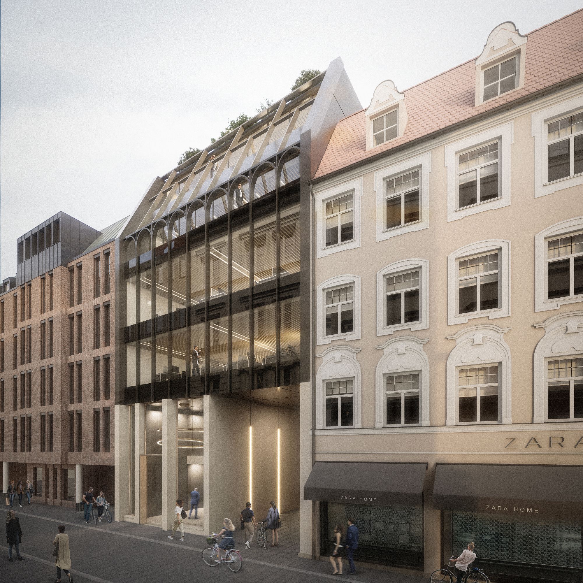 Das Gestaltungskonzept leitet sich aus der Analyse der Rosenstraße sowie des von Baudenkmälern geprägten Ensembles der Münchner Altstadt ab. Der Entwurf übernimmt die Lesbarkeit des Straßenzugs mit einer urbanen Erdgeschosszone, einer klar gegliederten Hauptfassade sowie einer Dachzone, die das Motiv der geneigten Dächer und Gauben zeitgemäß weiterführt. So entsteht ein neuer Rhythmus, der die Vielfalt der Umgebung ordnet, die Adresse stärkt und dem Gebäude eine eigenständige, ruhige Präsenz im Ensemble verleiht.