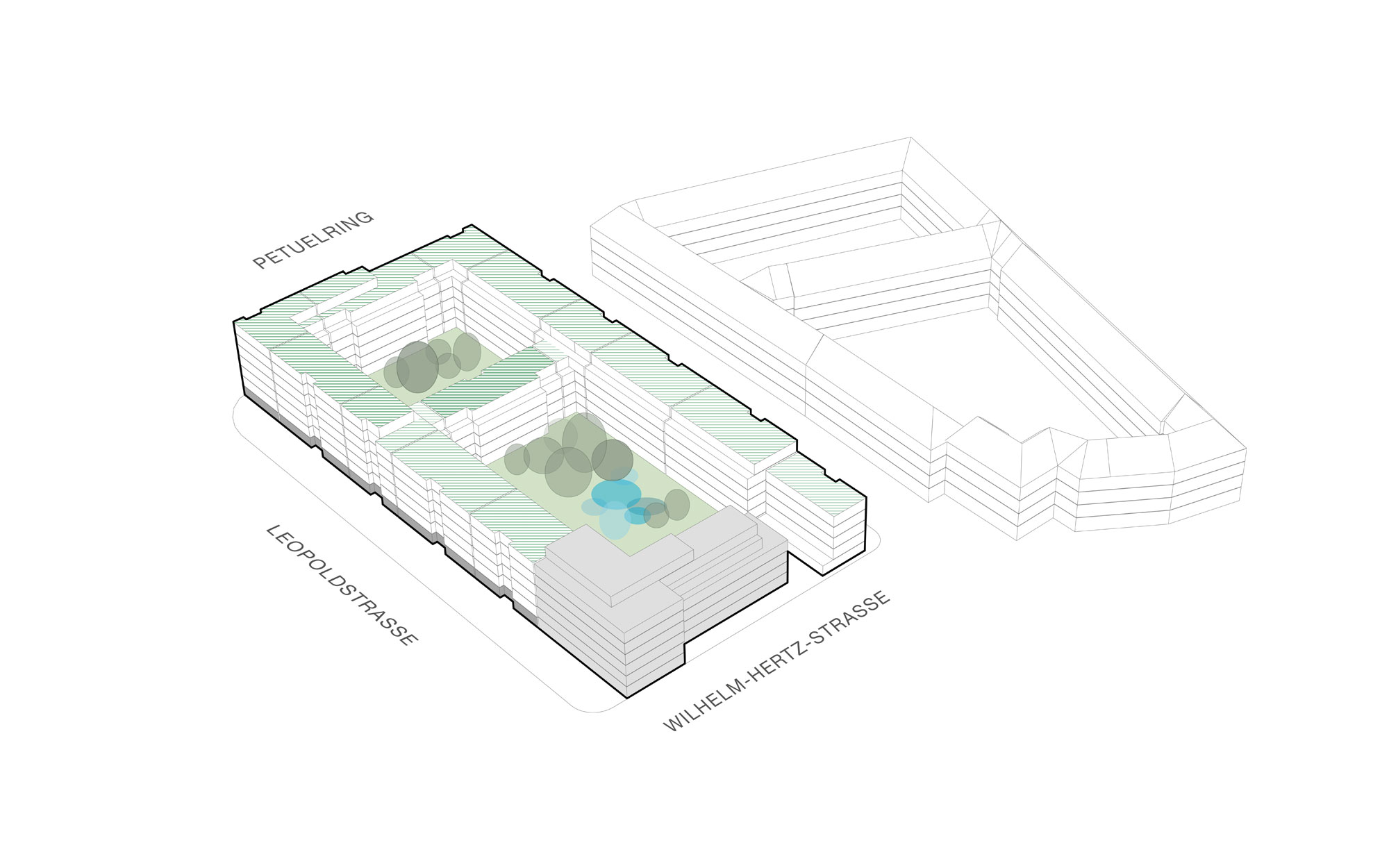 Due to the traffic and noise situation at the interface between Leopoldstrasse and the Mittlerer Ring, the perimeter block development is closed to the outside. The cubature takes up the facade lines of the first new building section in the southwest, which has already been realized. An elevation at the busy intersection forms a counterpoint to the existing development in the south.